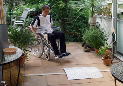 Diese Schwellenbrücke ermöglicht es Rollstuhlfahrern eine Türschwelle oder andere kleine Erhöhungen problemlos zu überwinden.