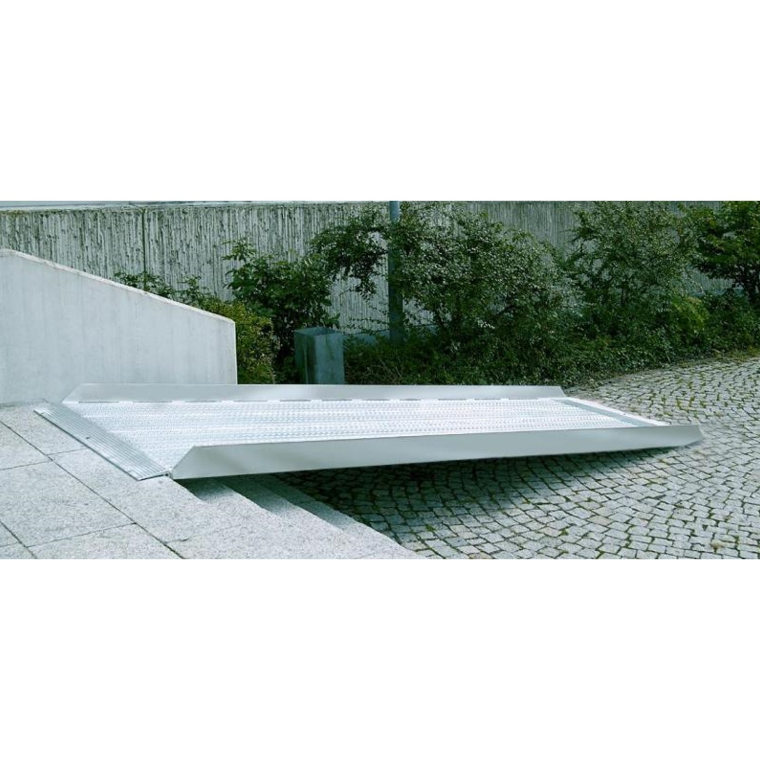 Diese 800mm breite Rampe dient in erster Linie zum Überbrücken von Treppen und hohen Absätzen. Durch eine spezielle Stanzung der Fahrfläche wird eine hohe Rutschhemmung gewährleistet und durch die Lochung kann Regen, Schnee und Schmutz schnell entweichen. Erhältlich mit einer Tragkraft bis 400kg/Schiene. Unsere Rampen sind GS-geprüft und entsprechen den Richtlinien der Berufsgenossenschaft. Optional auch mit Handlauf lieferbar.