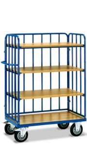 Etagen- Transportwagen mit vier Ebenen, drei Wänden und Schiebebügel