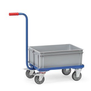 Dieser Griffroller mit Einhandbedienung besteht aus einer robusten Stahlrohr-Konstruktion. Die Ladefläche dieses Griffroller besteht aus einem Kunststoffkasten auf einer Winkelstahlrahmen-Konstruktion. Der Kunststoffkasten (LxBxH 600x400x220mm) des Griffrollers ist herausnehmbar. Um Ihre Ware sicher und ruhig verfahren zu können, sind die 2 Lenk- und 2 Bockrollen TPE-bereift, wobei die 2 Lenkrollen mit Feststeller ausgestattet sind. Um Ihren Griffroller vor Korrosion und Kratzern zu schützen, wurde dieser hochwertig pulverbeschichtet.