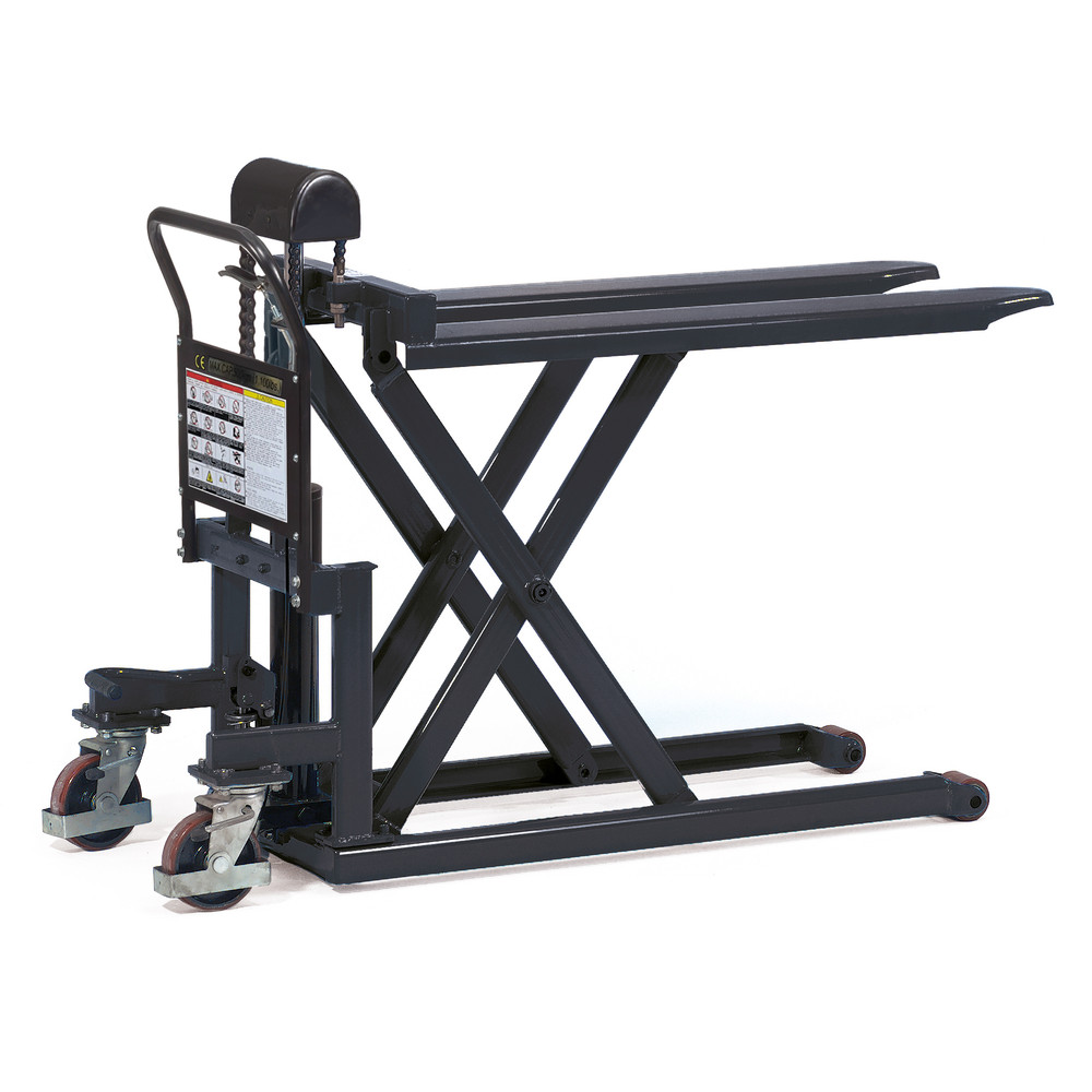 Dieser manuelle Scherenhubwagen kann wahlweise mit einer Tragkraft von 500 oder 1000 kg erworben werden. Bei der Ausführung mit 1000 kg Tragkraft ist eine Lenkdeichsel vorhanden. Das Besondere an dem Scherenhubwagen: Er ist auch mit angehobenen Gabeln noch verfahrbar!