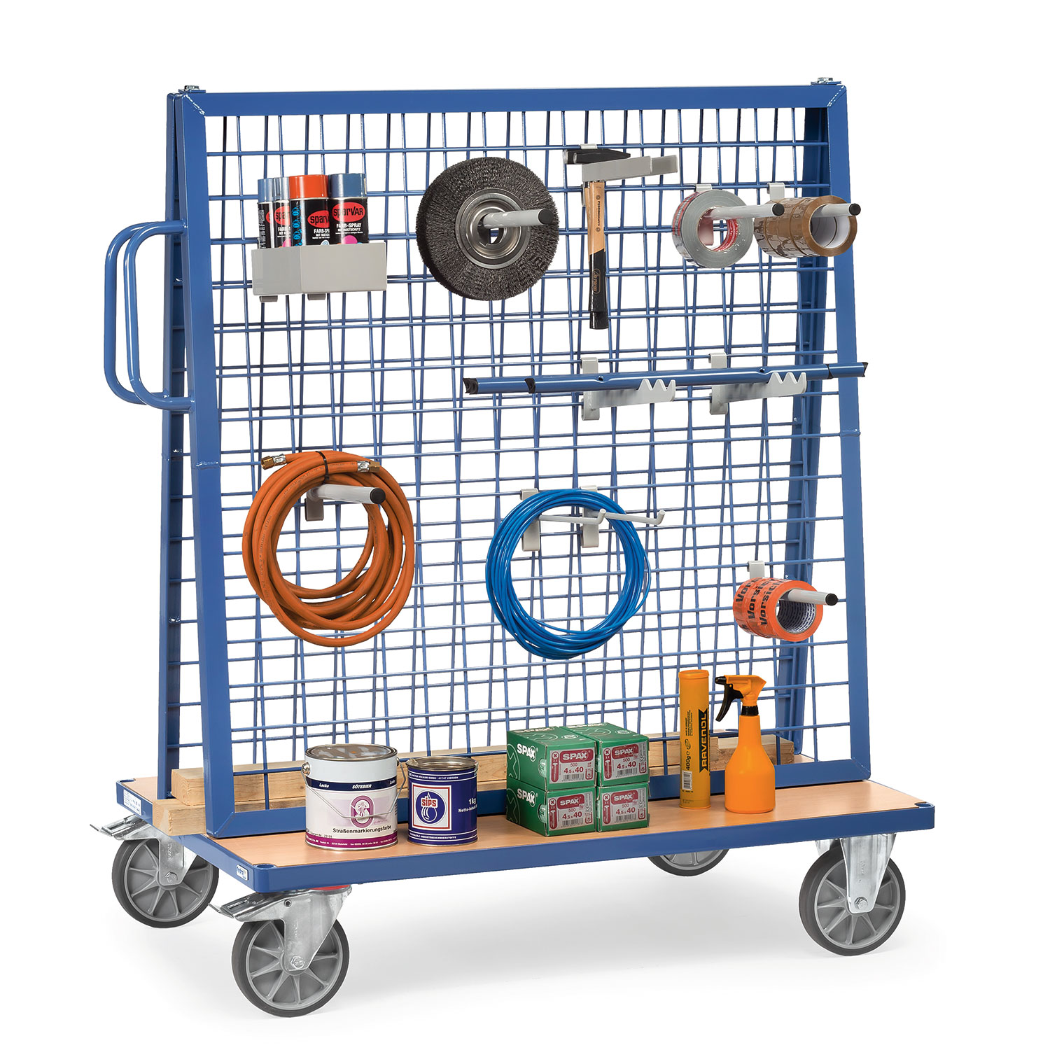 Dieser Werkstückwagen besteht aus einer Profilstahl-Konstruktion und verfügt über ein eingeschweißtes Drahtgitter. Er ist mit einer durchgehenden Holzwerkstoffplatte mit einer Oberfläche aus hochwertigen Buchendekor ausgestattet. Die Drahtgitter haben ein Maschnemaß von 75x75 mm. Durch die hochwertige Pulverbeschichtung ist die Oberfläche dieses Transportwagen dauerhaft vor Korrosion und Beschädigungen geschützt, schlag- und kratzfest. Durch die TPE-bereiften Lenk- und Bockrollen läßt sich der Wagen bodenschonendverfahren. An den Lenkrollen sind zusätzlich Feststeller angebracht. Diese fixieren den Werkstücktransportwagen an Ort und Stelle und verleihen ihm eine gewisse Standfestigkeit. Die Tragkraft beträgt 600 kg.