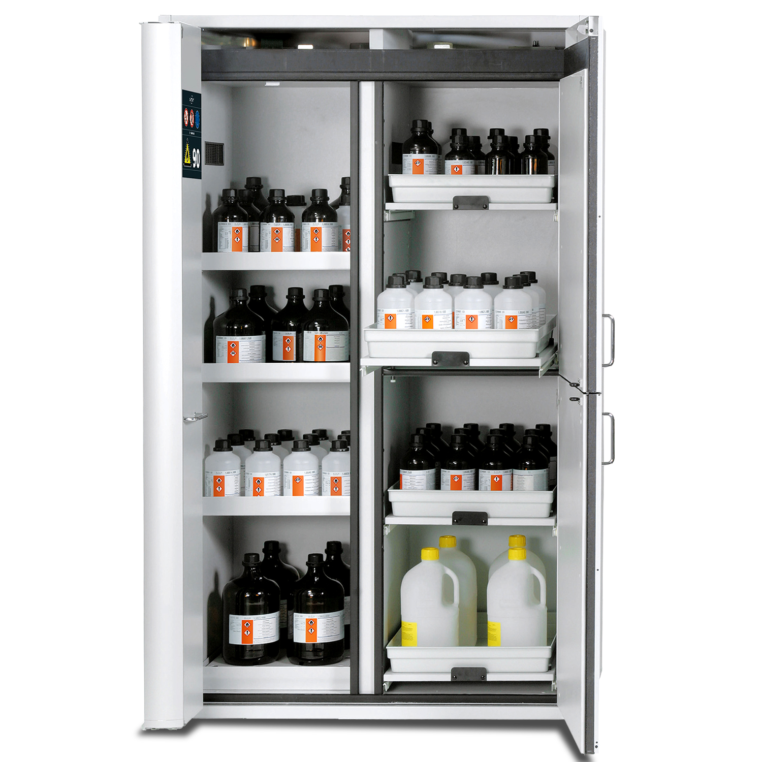 Dieser Kombi-Sicherheitsschrank verfügt über zwei Kammern (Abteilungen). Zum einen verfügt er über das Schrankabteil VBFT, welches nach DIN EN 14470-1 (Typ 90), Feuerwiderstandfähigkeit 90 Minuten geprüft ist und sich aufgrund dessen für die Lagerung von entzündbaren Flüssigkeiten eignet und zum anderen über das SL-Abteil, welches sich für die Lagerung von Säuren, Laugen und anderen aggressiven Gefahrstoffen eignet.